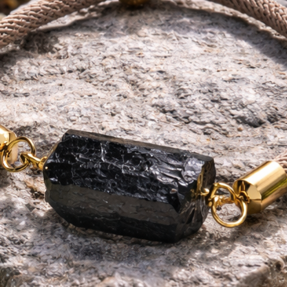 Entièrement fait main avec soin, ce bracelet sur cordon met en valeur une tourmaline noire brute, pierre naturelle réputée pour ses vertus apaisantes et son influence positive sur la concentration. Véritable alliée du quotidien, la tourmaline noire aide à relâcher les tensions, à calmer le stress et à retrouver un équilibre intérieur durable.
