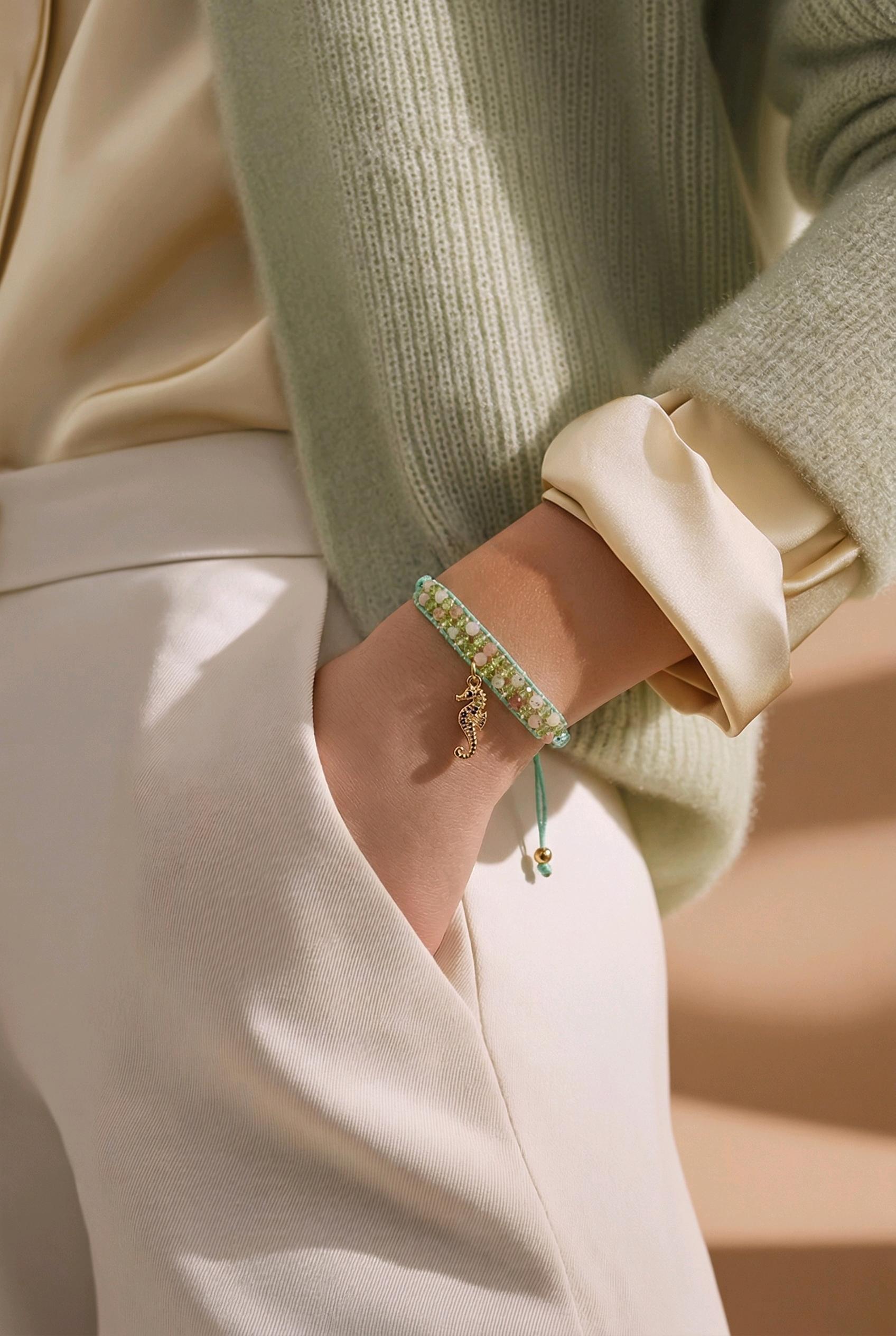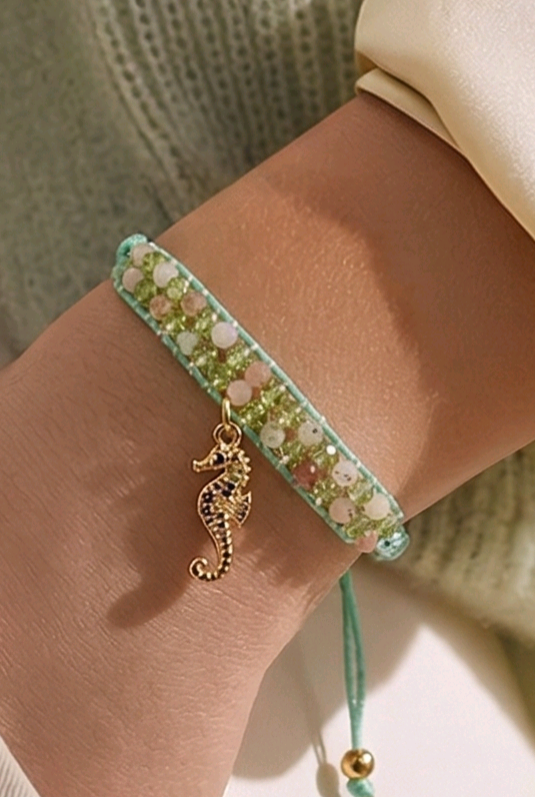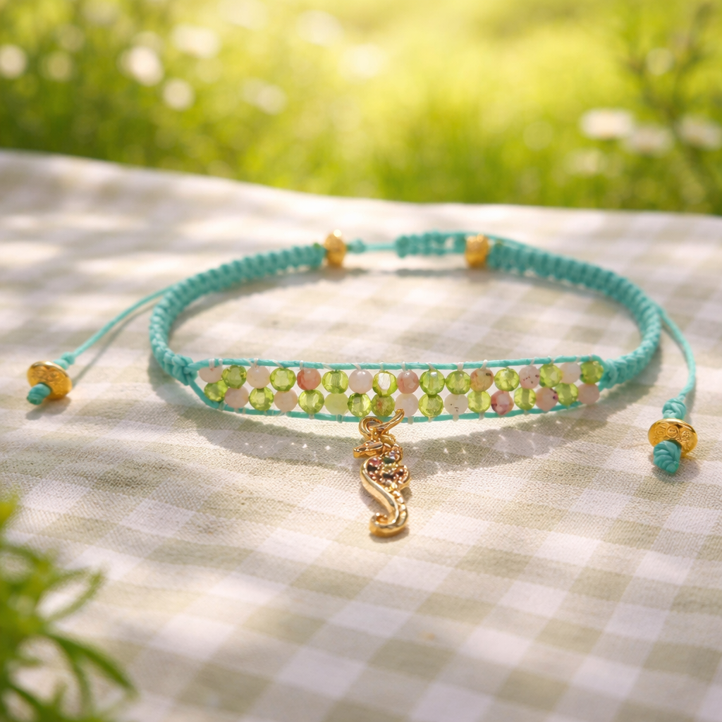Découvrez ce magnifique bracelet réglable en macramé artisanal, une pièce unique qui allie élégance et délicatesse. Confectionné à la main avec un savoir-faire authentique, il met en valeur de sublimes pierres naturelles : opale rose et péridot de 2 mm, soigneusement sélectionnées pour leur éclat et leur finesse.