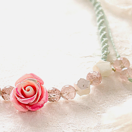 Au centre, un charmant bouton de rose évoque l’amour sincère, la tendresse et la beauté des sentiments naissants. Il est sublimé par de lumineuses pierres facettées en quartz cerisier, dont les reflets délicatement rosés captent la lumière avec raffinement.