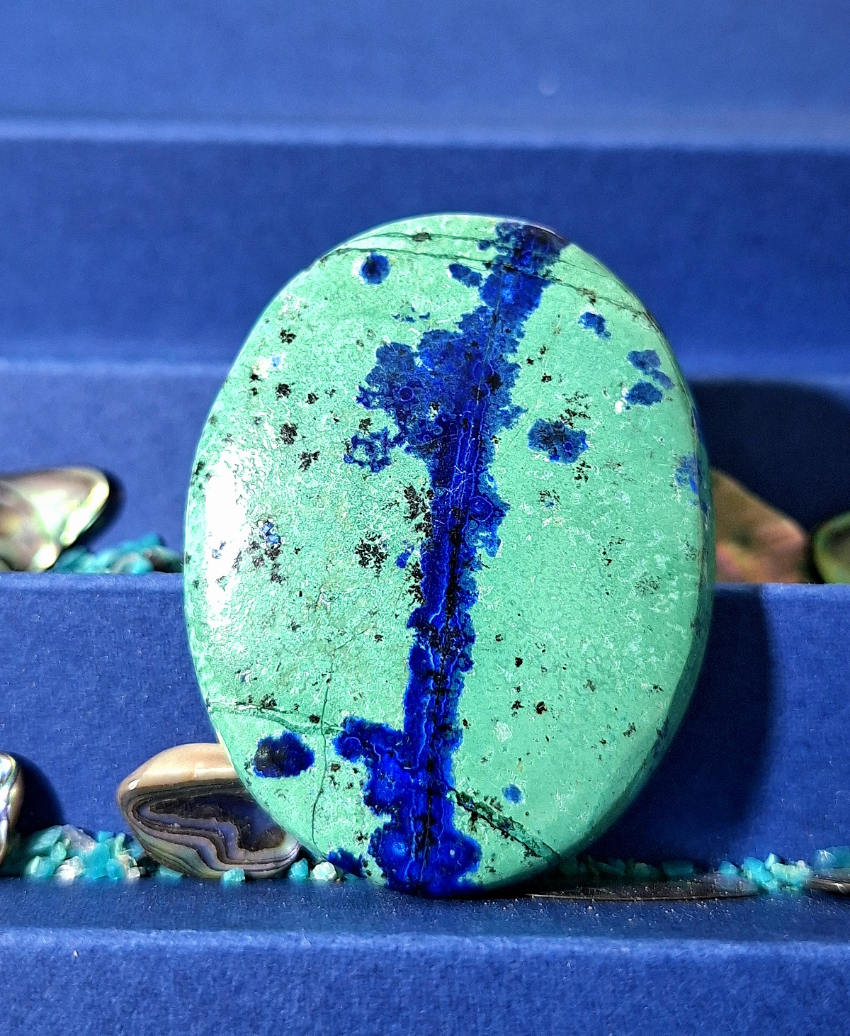 L’azurite chrysocolle est une pierre associée à la transformation et à l’harmonie. Elle est souvent utilisée pour favoriser une perception plus positive du quotidien et pour inciter à mieux comprendre ses émotions. Elle encourage à profiter du moment présent, à prendre du recul et à développer un état d’esprit plus ancré et détendu.