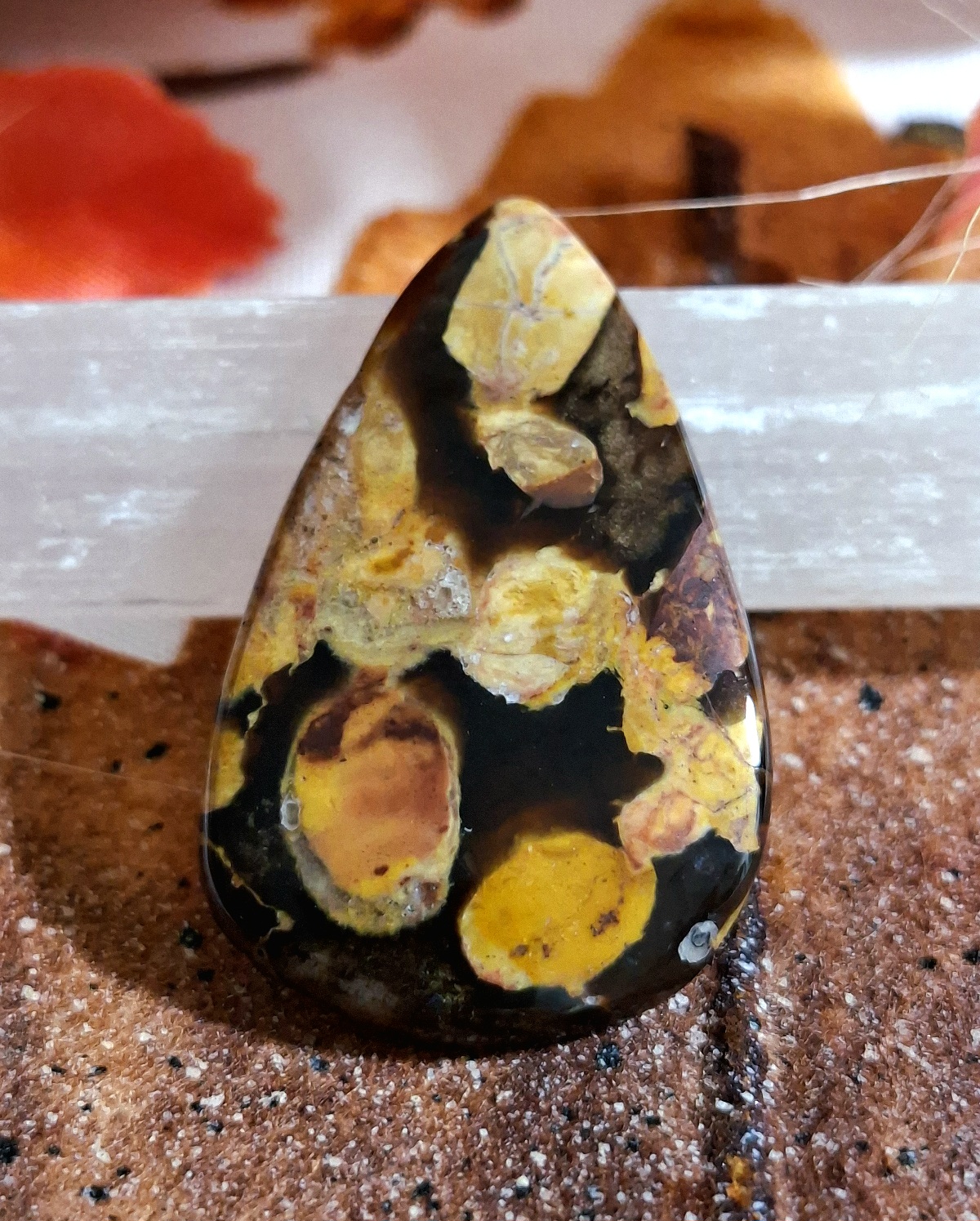 Peanut Wood (bois cacahuète) est un bois pétrifié (fossile) qui s’est fossilisé dans l’eau de mer. Ce drôle de nom lui a été donné à cause de multiples zones blanches, dont il est parsemé et qui ressemblent à des cacahuètes. Ces tâches sont des galeries dues à un petit mollusque qui a creusé le bois avant sa fossilisation. Ce bois fossile très rare nous vient exclusivement de la côte ouest de l’Australie, du fin fond du crétacé (plus ou moins 70 millions d’années quand même).