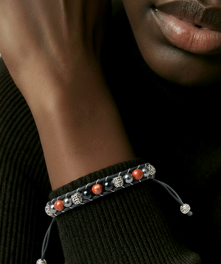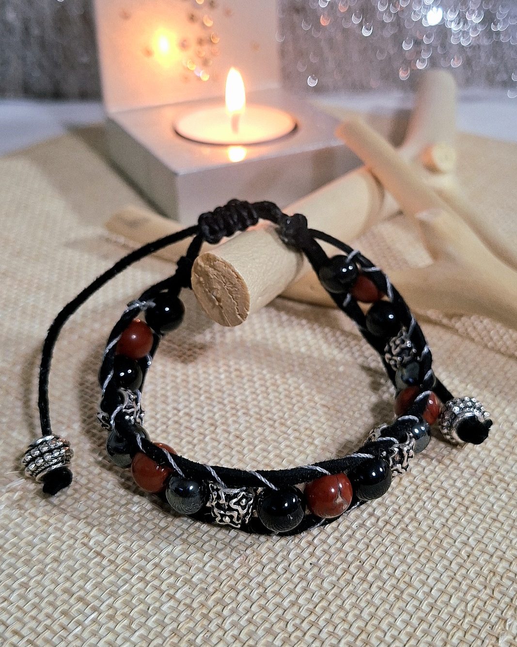 Ce bracelet homme en jaspe rouge, tourmaline et hématite, pierres naturelles de force, confiance, énergie et concentration, allie caractère et raffinement.